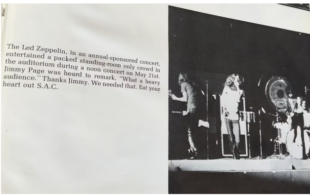 - The musicians in the yearbook photo look an awful lot like Led Zeppelin, including their clothing, which can be verified as clothing they wore on stage in 1970 from other photos of that tour. The lighting and the stage also look like what you would see at high school concerts from that era.